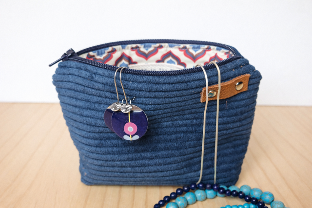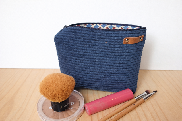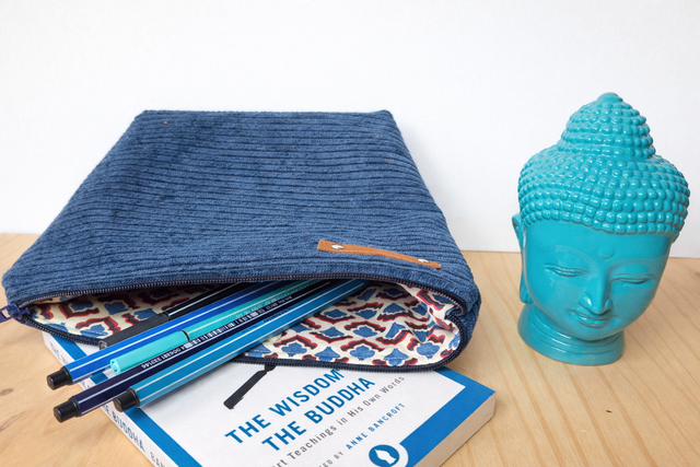 Découvrez la collection de pochettes "Lorient", une ligne d'accessoires artisanaux, conçus pour organiser vos essentiels avec élégance. Ces pochettes arborent un extérieur en velours côtelé bleu marine d'une grande douceur, contrasté par une doublure intérieure en tissu à motifs orientaux assortis. Un détail en cuir vient parfaire cette création "Made in the Baie".