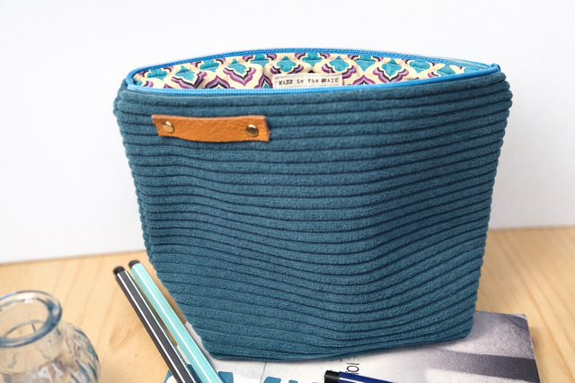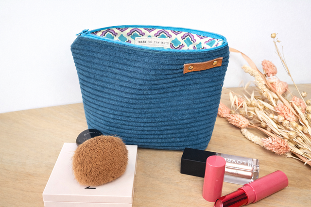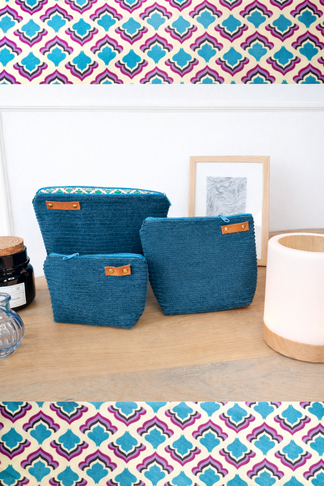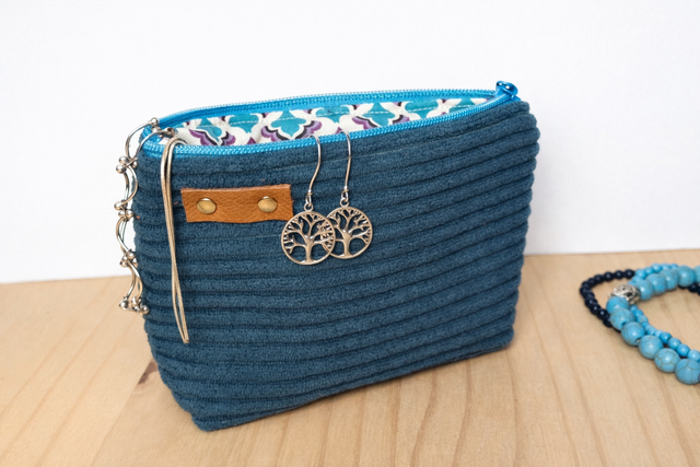 Voyagez au quotidien avec la collection "Massilia", une gamme de pochettes artisanales qui marie un velours côtelé bleu canard à l'élégance d'un tissu aux motifs orientaux turquoise et pourpre. Chaque pièce est finie par un détail en cuir véritable, apportant une touche de caractère à ces créations aux finitions soignées.